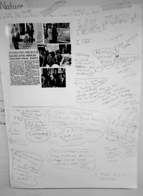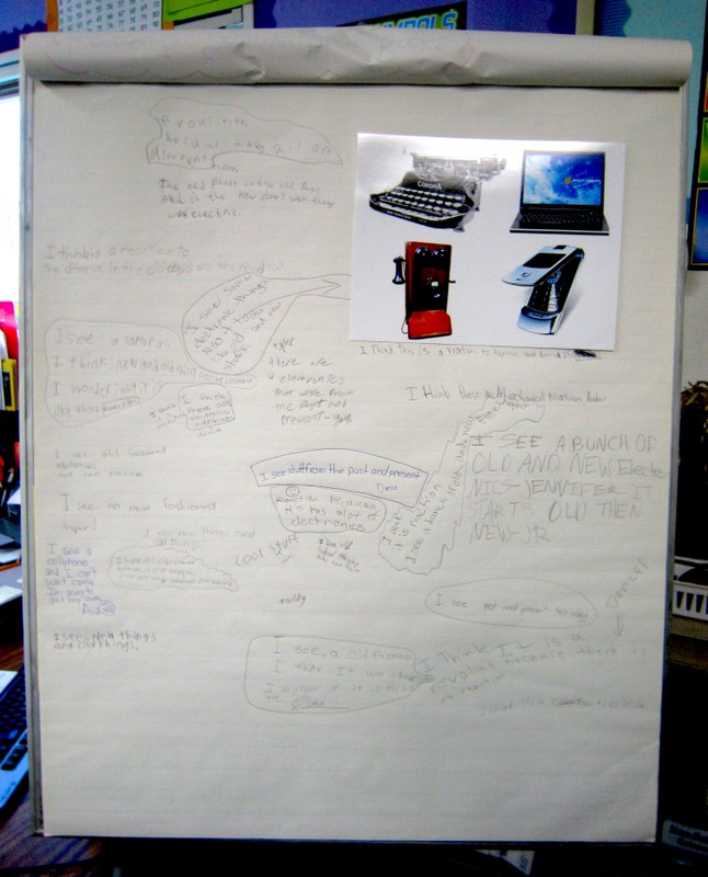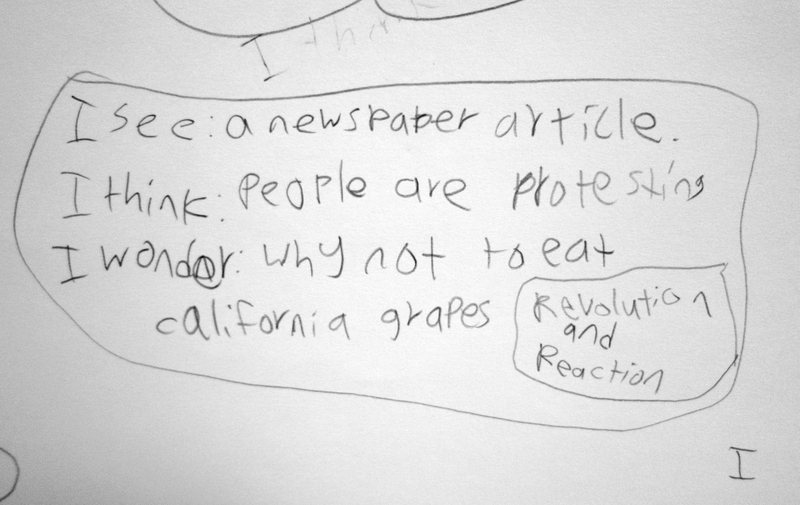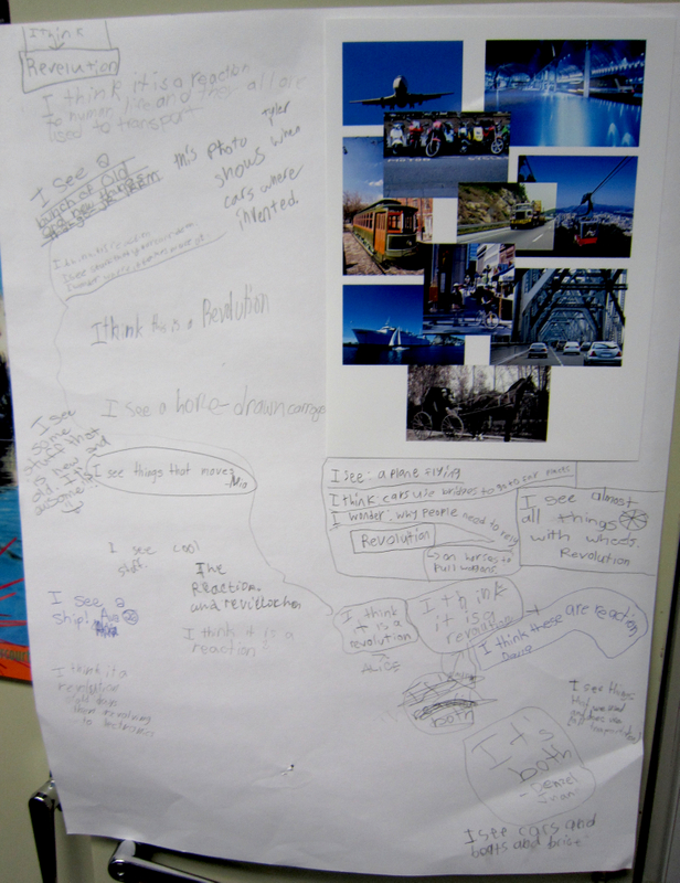 Next, students rotate around the room in teams to analyze photos of historical events responding in writing with "I see. . . I think. . . I wonder. . .". Ms. DiMaggio was careful in selecting a wide variety of photos to post given the complexity of these concepts and to address possible misconceptions or limits to understanding. For example, some students initially focused on the word "revolution" being related to war or the 1800s. When they analyzed a photo of technology, they quickly realized a broader definition of "revolution."